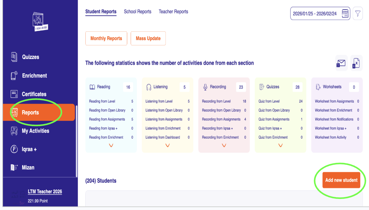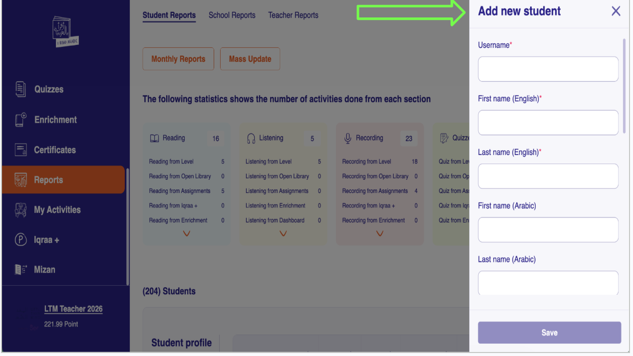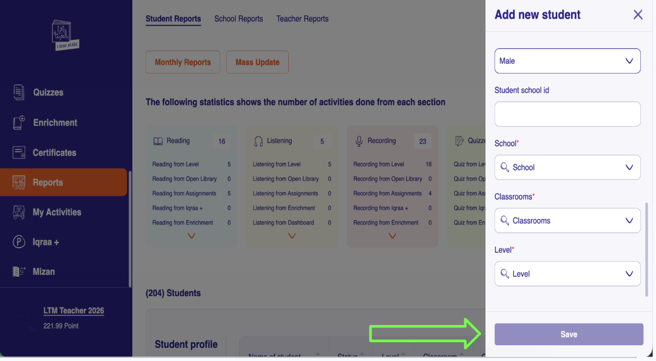 Once the student is added to the "I Read in Arabic" program, they will be able to explore the educational content, complete exercises, and track their progress in reading and books.