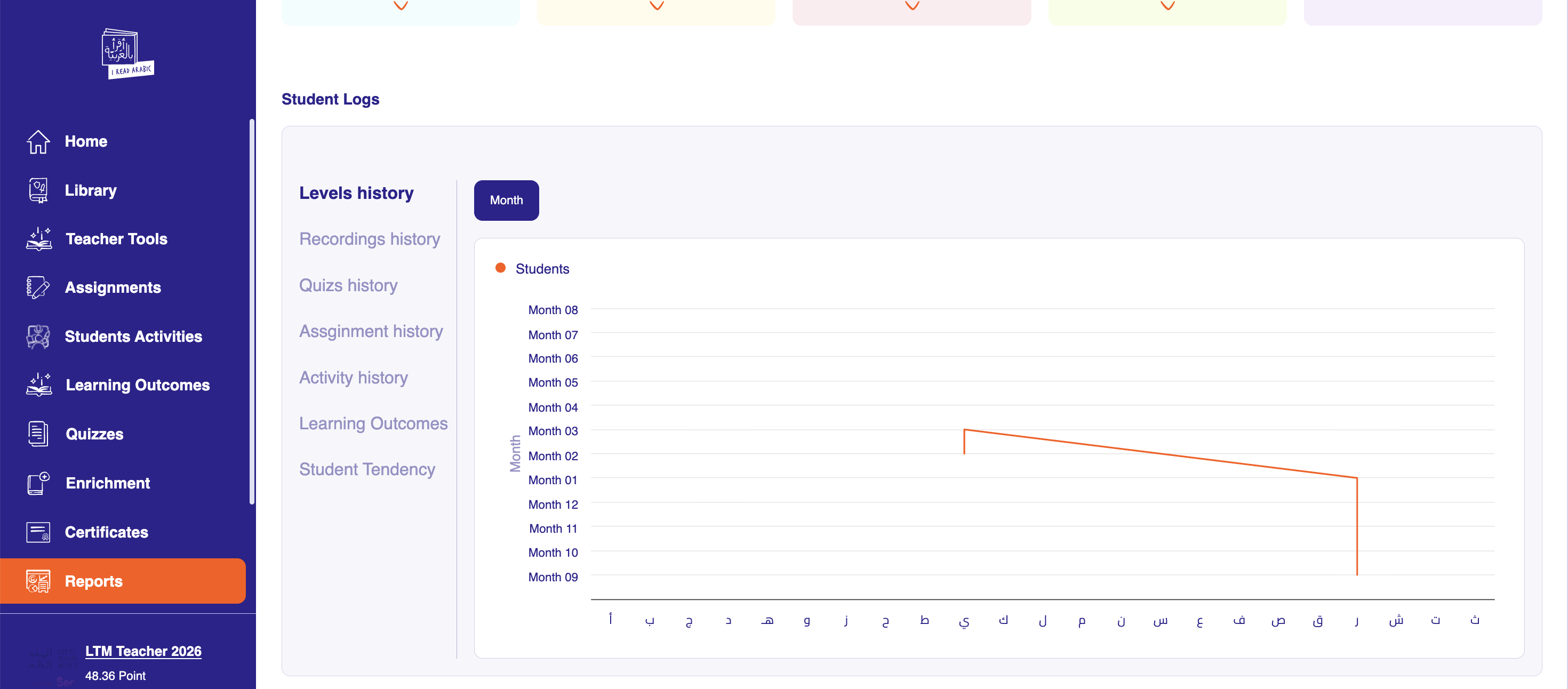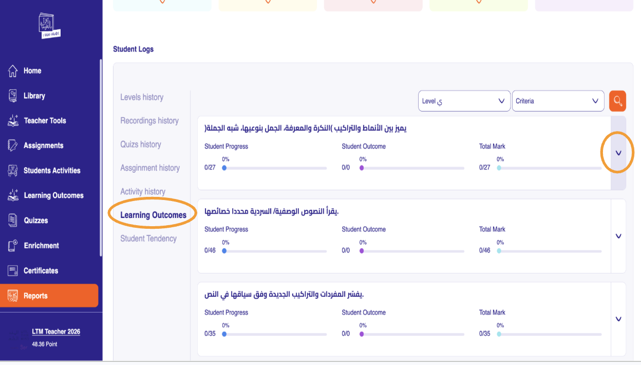 The page will show the student's expected learning outcomes by level, with achievement percentages for each. Clicking the arrow next to an outcome reveals all related books and worksheets.