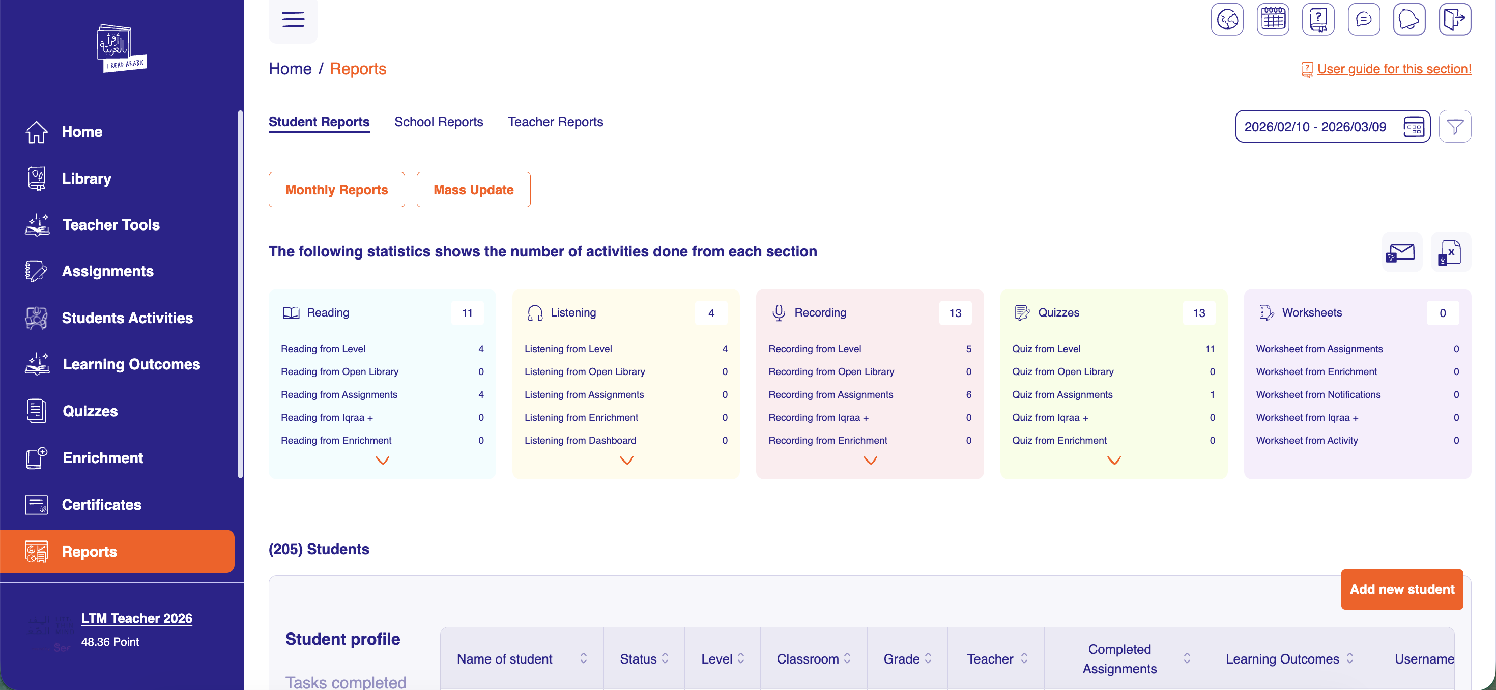 Clicking a student's name shows their activity details, including the number of books listened to, read, tests completed, recordings, and worksheets finished, based on the selected time period (day, week, month, or year).