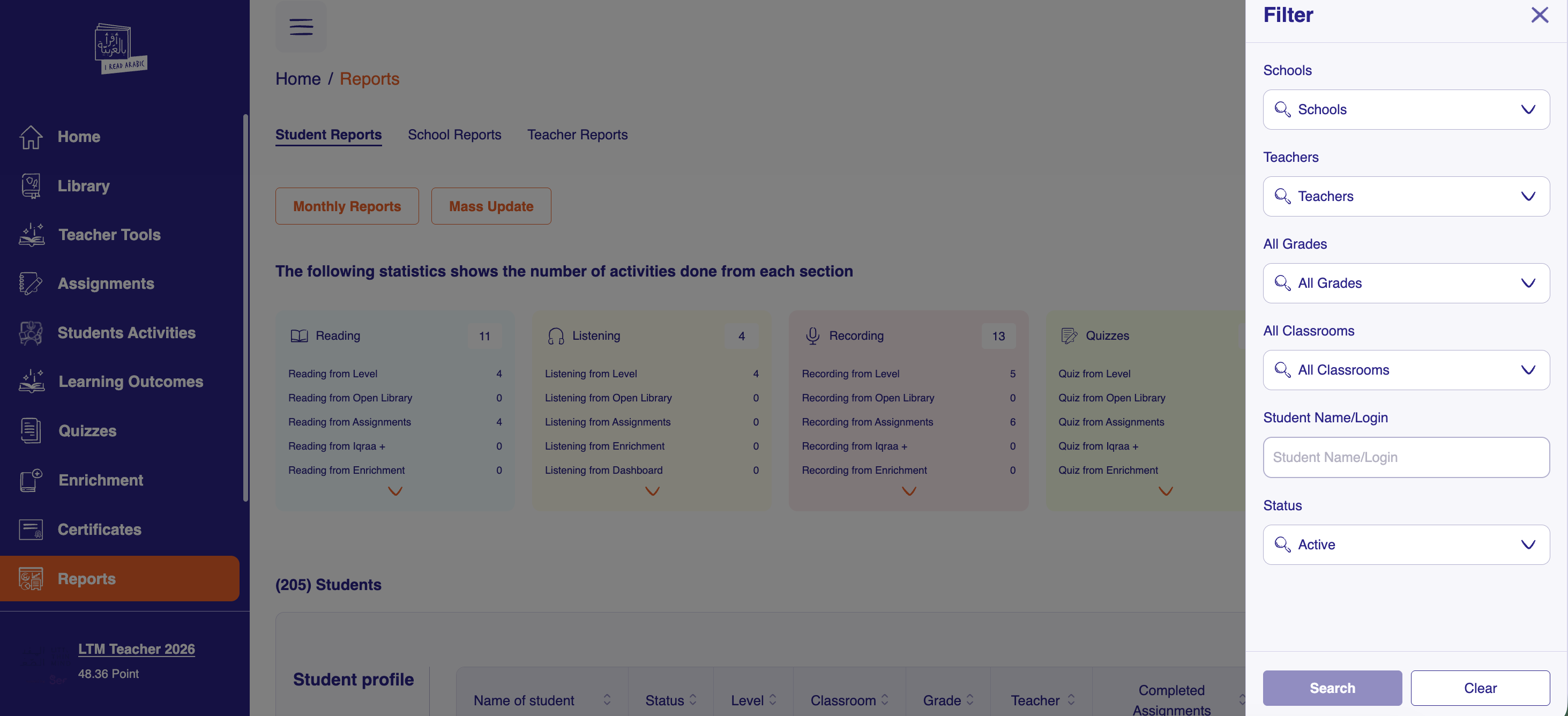 Teachers are able to view and download student performance reports. Additionally teachers can print a report showing student performance over a specific period or send them via email.