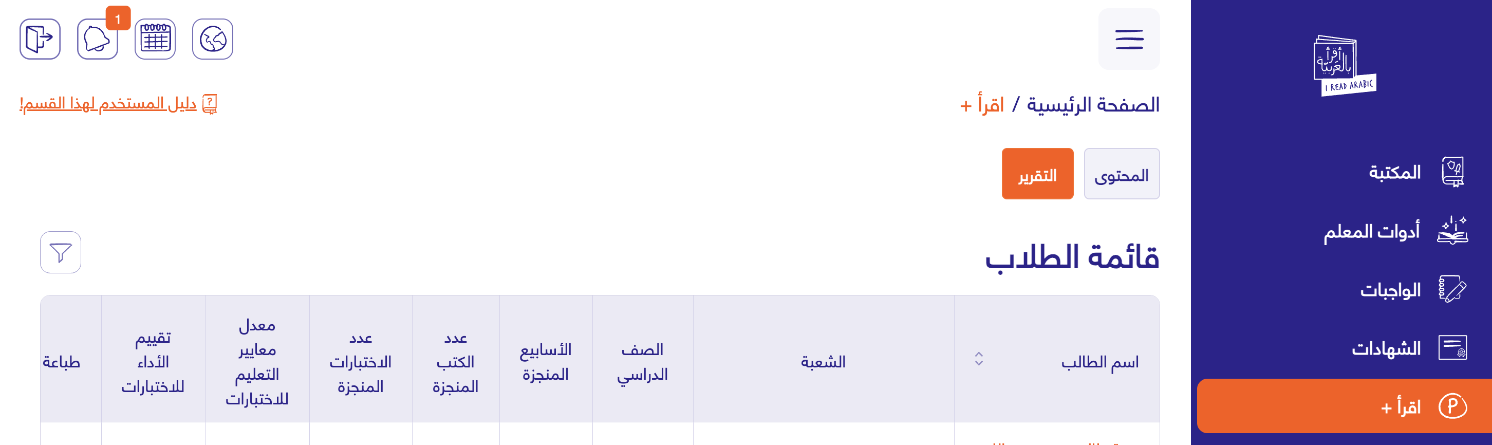 Iqra+ Report provides a comprehensive tool to track student performance and measure their progress in the Iqra in Arabic+ program, offering teachers and administration a clear picture of achievement levels, student activity, and interaction with the educational content.