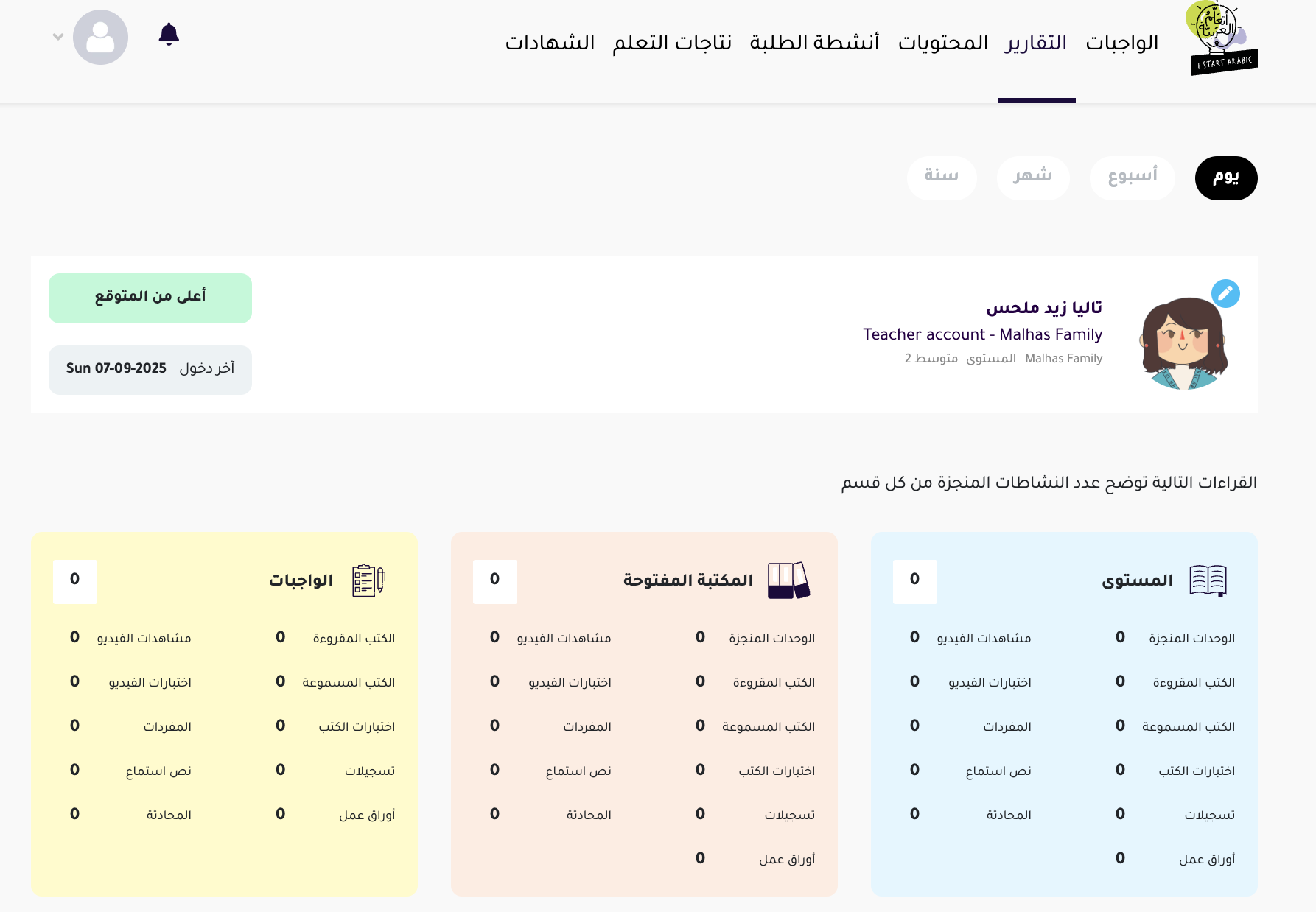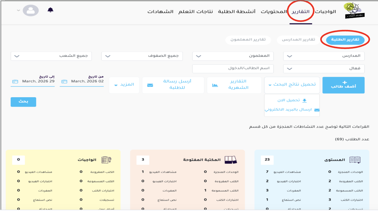 Student reports in the teacher’s account within the Ataallam Al-Arabiya program are a comprehensive tool that enables teachers to monitor student performance accurately and thoroughly, while providing a clear view of progress and achievements on the platform. These reports support the educational process by offering analytical data that helps teachers make decisions based on actual performance.